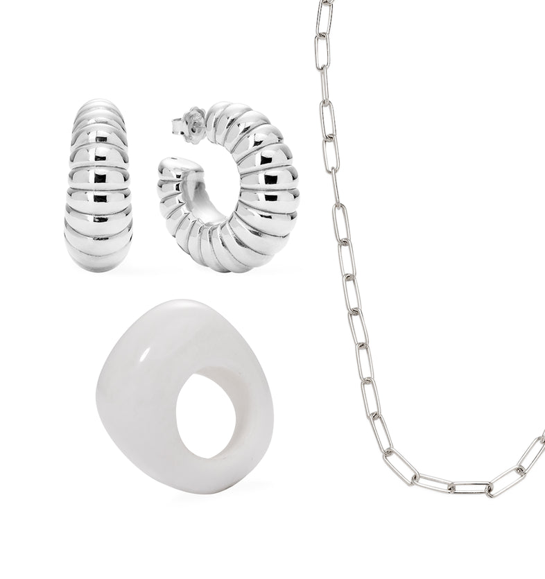 The set includes: Riffle Silver Earrings, White Stone Ring, Eternal XII Silver Necklace