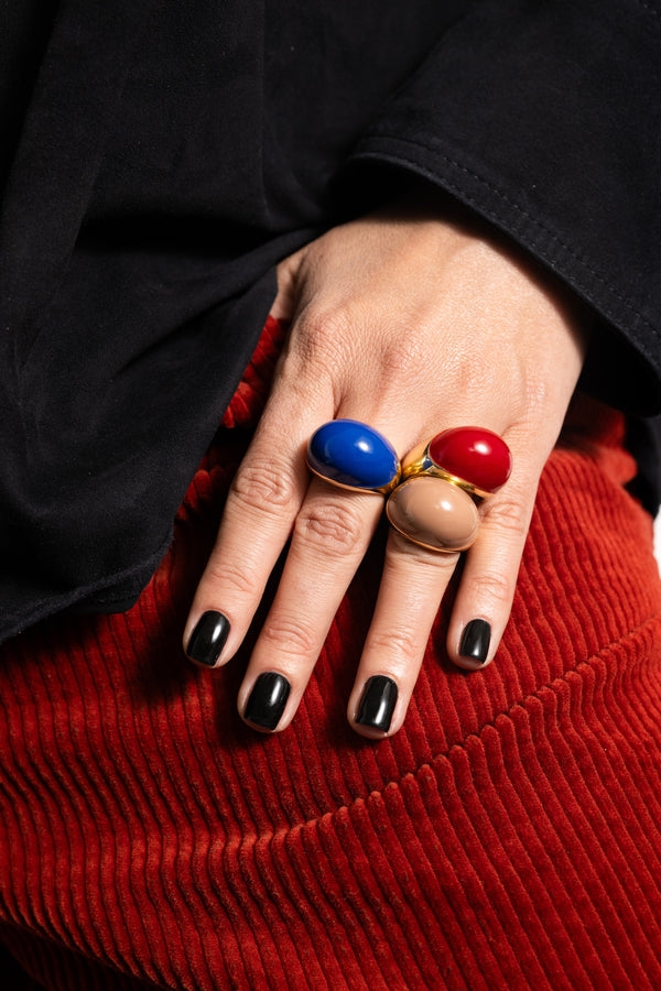 The VIVA Forget Me Not ring in the XL version is made of 925 silver and covered with a layer of 18-karat gold. The characteristic, convex dome at the top has been carefully covered with shiny enamel in an intense shade of blue. The color combination and smooth, lacquered finish add a modern, slightly artistic expression to the whole. The integrated form without open adjustment fits well on the finger and remains stable during the day. The ring retains its shiny gold plating from the bottom, which adds lightness and contrast. Each size has been designed to provide the best possible fit to the hand.