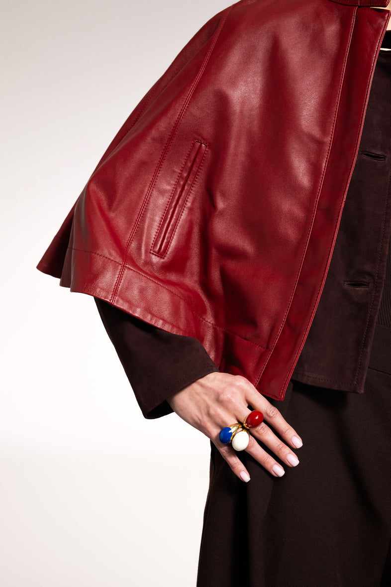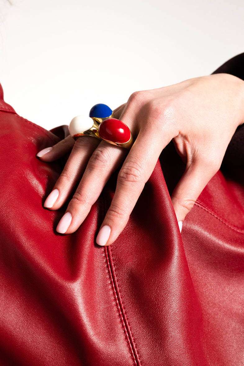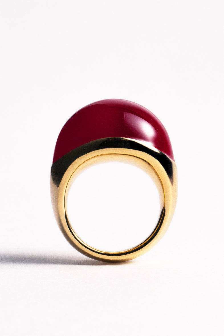The large VIVA Cherry XL ring is a piece of jewelry that attracts attention with its intense color and simple form. Made of 925 silver, covered with 18-karat gold, with the upper part covered with cherry enamel. Its massive, rounded profile gives a distinct character, while ensuring comfort of wearing. The ring fits perfectly with both everyday styling and more daring sets, and each size has been designed to provide the best possible fit to the hand.