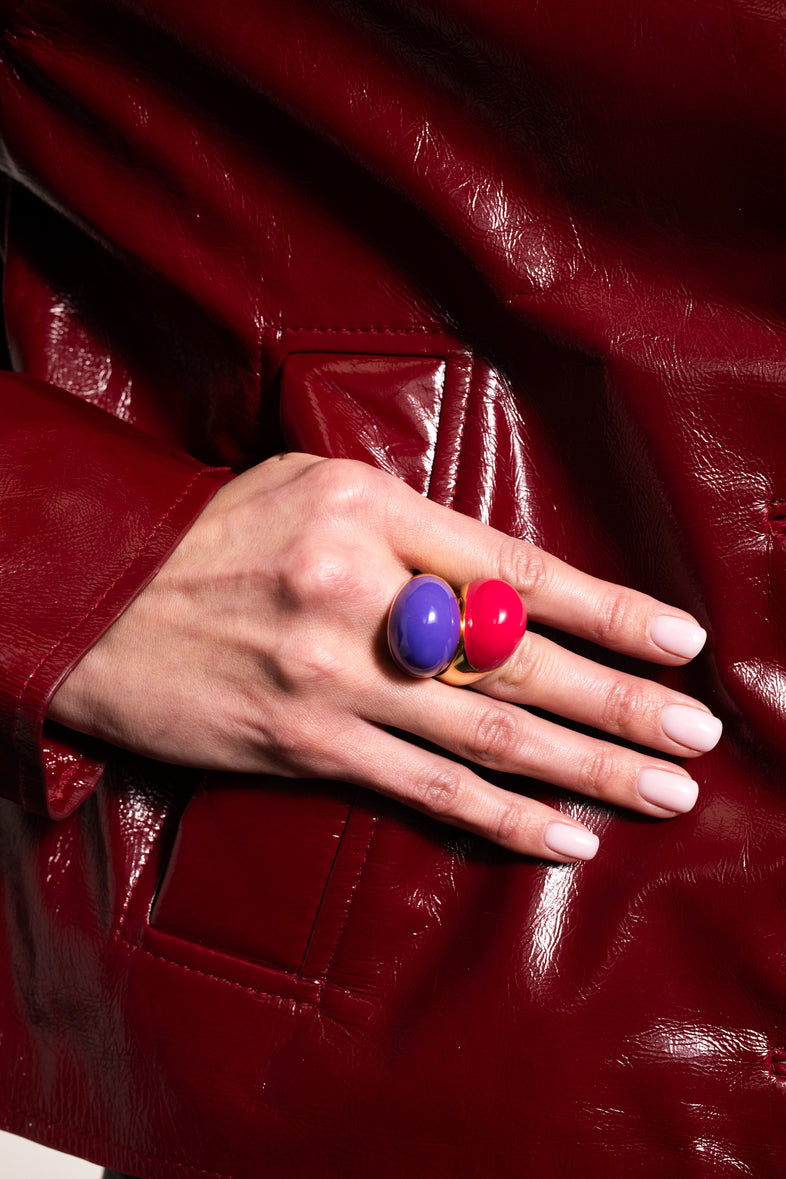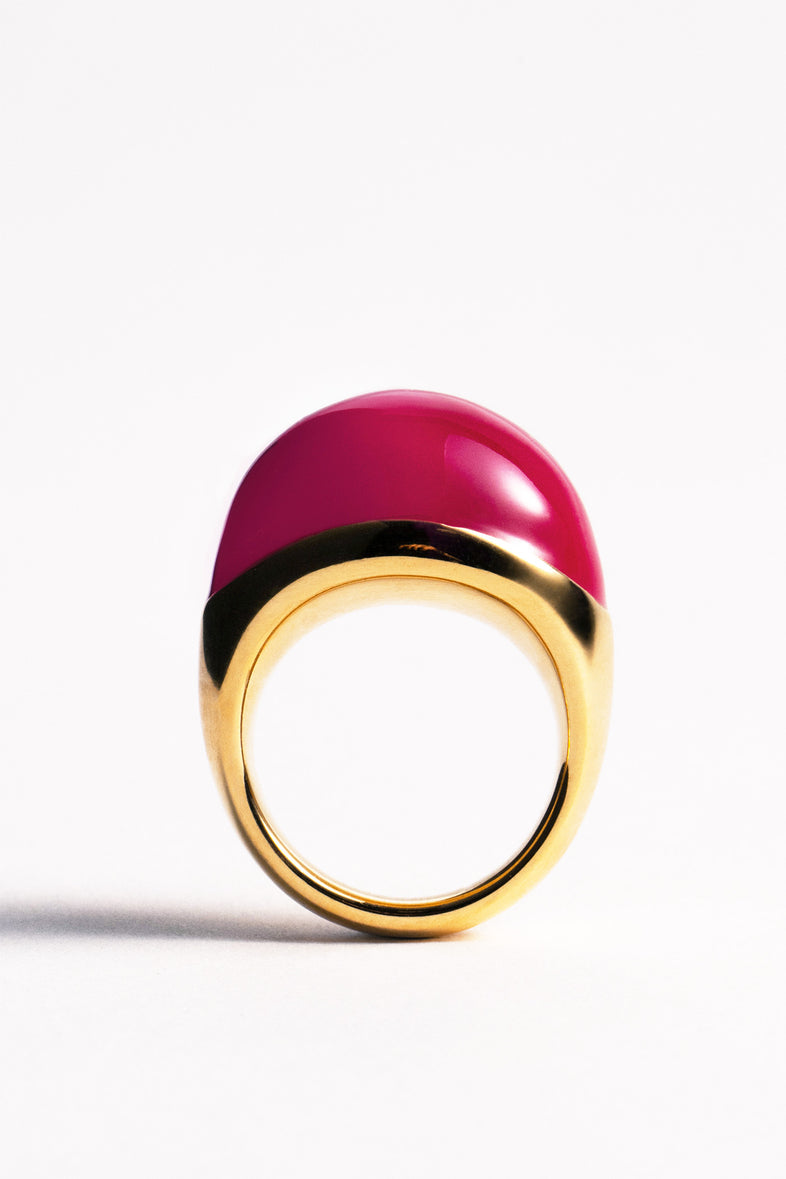 Pozłacany ciemnoróżowy pierścionek Viva Raspberry XL to prawdziwy hit naszej kolekcji. Ten duży, emaliowany pierścionek ma aż 17,5 mm szerokości w najszerszym miejscu, łącząc luksus złota z intensywnym kolorem. Wykonany ze srebra próby 925, pokryty 18-karatowym złotem, dostępny w rozmiarach 13, 15 i 17, 19.